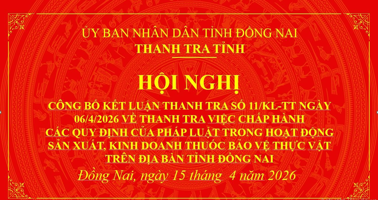 Ngày 15/4/2026, tại Thanh tra tỉnh Đồng Nai, Đoàn thanh tra theo Quyết định 29/QĐ-TT của Thanh tra tỉnh đã tổ chức công bố Kết luận thanh tra việc chấp hành pháp luật trong hoạt động sản xuất, kinh doanh thuốc bảo vệ thực vật trên địa bàn tỉnh Đồng Nai